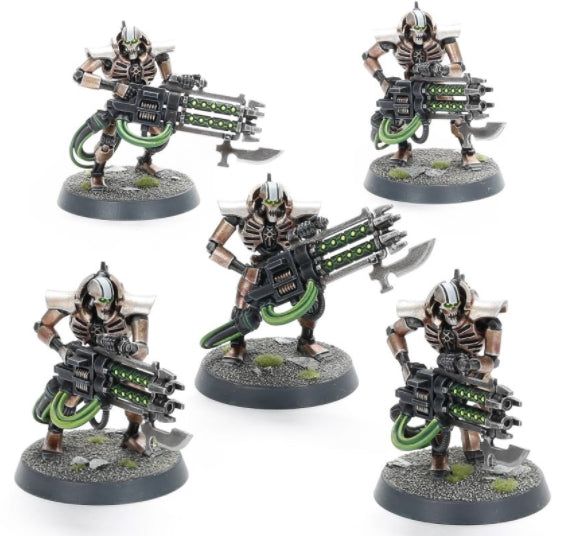 I Necron Immortals possiedono la consueta ed inquietante sagoma scheletrica della loro razza. I lunghi arti sono tenuti assieme da borchie metalliche e si ergono ricurvi, mentre le teste sono racchiuse tra piastre di corazza ed elaborati spallacci. L'iconografia necron è mostrata sullo sterno. Puoi equipaggiarli con i devastanti fucili gauss e le carabine tesla.