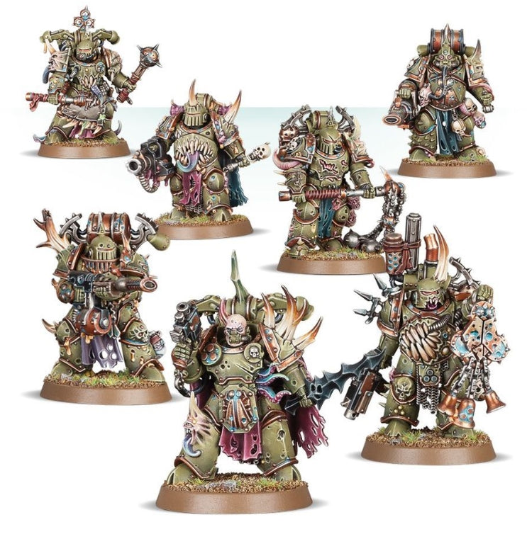 Rigonfi di corruzione e malattie, i Plague Marines formano la colonna portante della Death Guard, e, a differenza di molte altre Legioni Traditrici, i loro numeri hanno continuato a crescere nel corso dei millenni. Servitori giurati di Nurgle, i Plague Marines hanno corpi disgustosi e marci che puzzano di decomposizione. Il liquido putrido che gli gorgoglia fuori dalle vesciche corrode l'armatura e la pelle, ma nonostante siano orrendamente sfigurati rimangono guerrieri temibili.