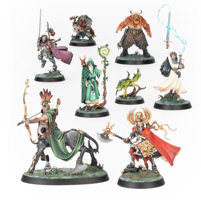 - 7x miniature degli eroi e 1x compagno realizzate in plastica beige: Edmark Valoran, Bren Tylis, Inara Sion, Drolf Testa di Ferro, Kelthannor, Drasher Vorn e Jacobus Vyne con Fronda