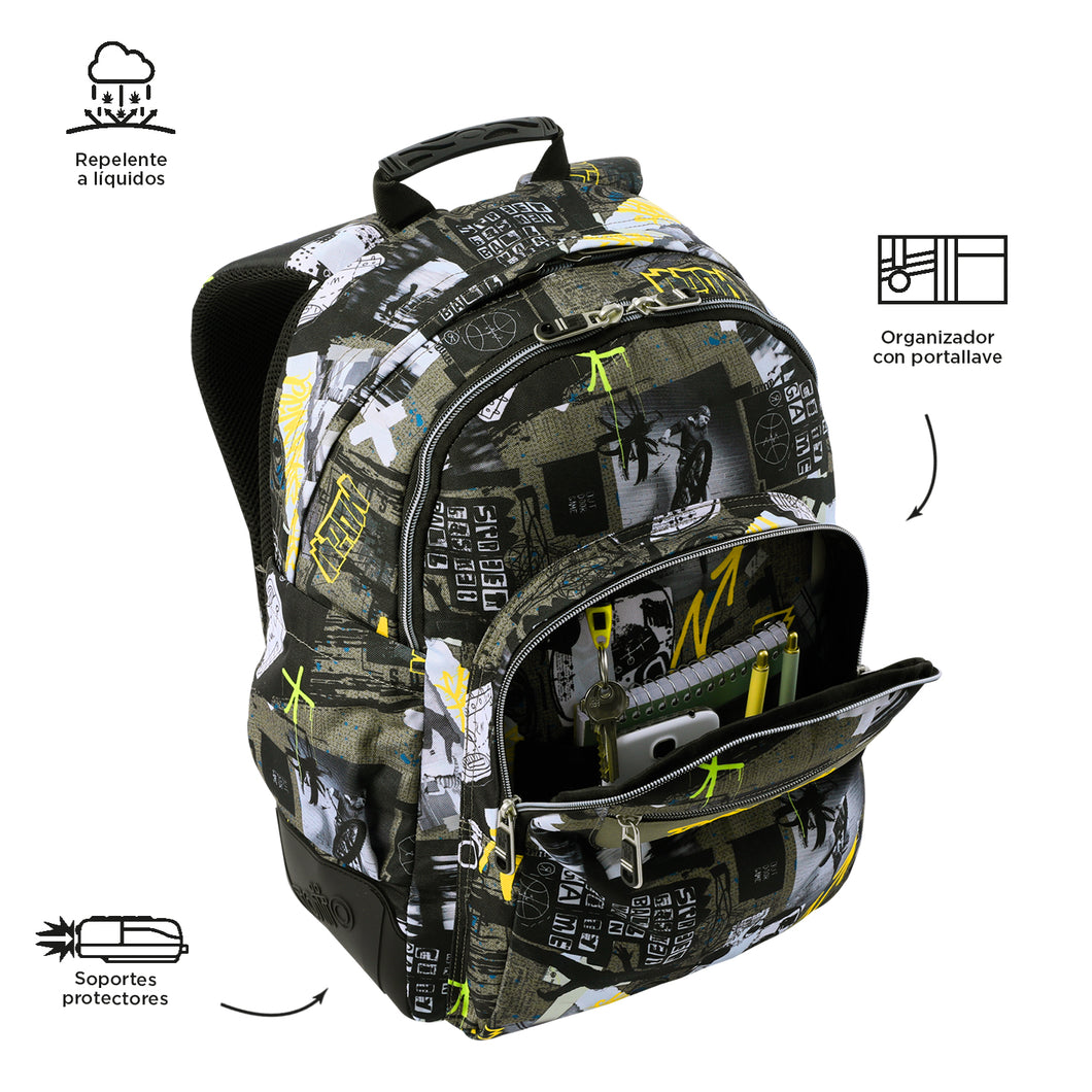 Lo zaino Rayol della collezione Ecole è perfetto per la scuola. È realizzato in tela RPET, ricavata da bottiglie di plastica riciclate, il che lo rende un'opzione sostenibile. È dotato di uno scomparto principale e due scomparti anteriori di rapido accesso, oltre a una tasca dedicata per un laptop da 14 pollici. Le tasche laterali sono ideali per trasportare una bottiglia o un ombrello. Il rinforzo in gomma sulla base e i supporti protettivi in PVC garantiscono durata e resistenza agli sfregamenti. Inoltre, lo schienale ergonomico Air Mesh e le cinghie garantiscono un comfort superiore, mentre l'organizer con portachiavi mantiene ogni cosa al suo posto. Un'opzione completa per la vita quotidiana a scuola!